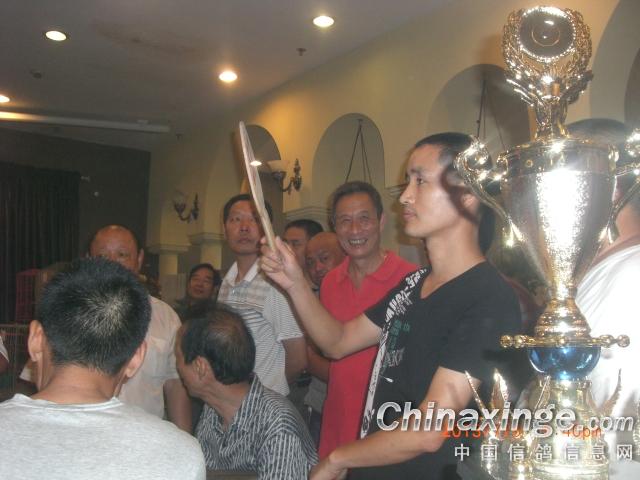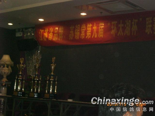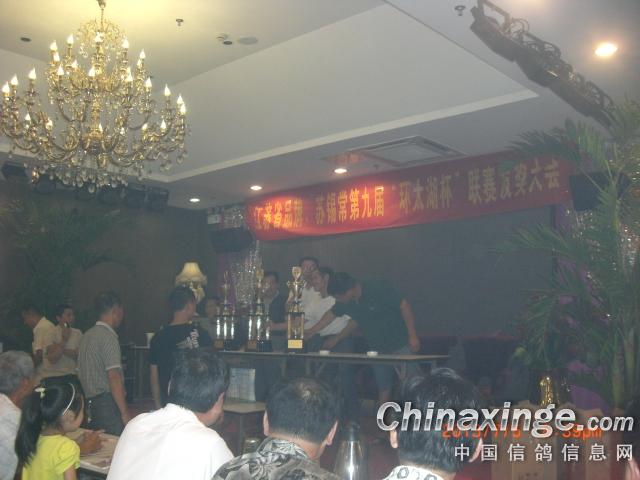 今天(7月6日)是苏南三市苏、锡、常第九届环太湖颁奖拍卖会,会场定在常州的广缘大酒店里,俺与鸽友老虎、王师傅一大早就从常熟起程去参加这次拍卖。环太湖春季特比赛已在苏南地区鸽友中有着深厚的基础,此次售环近万枚,再加之遇禽流感延迟了一个月才比赛,比赛当天气温高且闷雨,三市总冠军分速不足一千米。这是一场艰难的赛事,由于俺有只红轮进奖,获三市总排名六十七位,要参加拍卖(前一百二十名必须参加拍卖),所以今早与老虎和王师傅这两位也同场获奖的鸽友一道起程,一来拍回自己的爱鸽,二来过过鸽瘾,感受一下拍卖会场的热闹气氛!