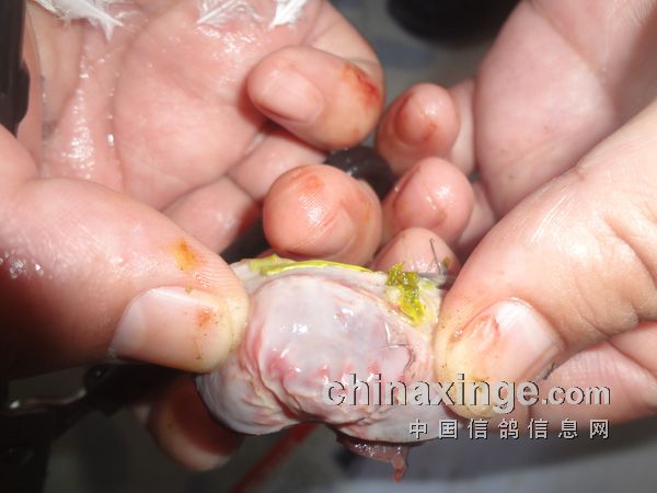 病鸽嗉囊有积食、积气现象,鸽极度消瘦,不采食。