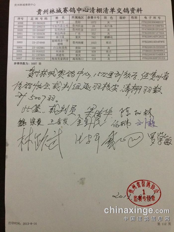 贵州林城赛鸽中心在15公里训放三天之后,于8月13日晚上进行清棚。贵州省信鸽协会公棚管理委员会对存棚赛鸽逐羽核实,清棚羽数总计5007羽。以下是现场图片报道: