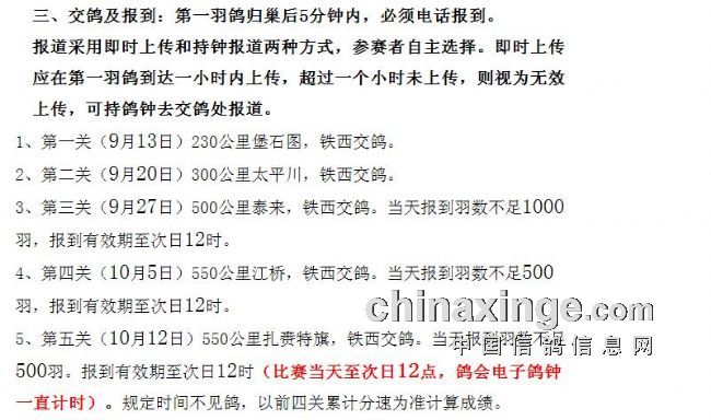 沈阳市今年秋赛共举办180、230、300、500、550、550、500公里七场比赛,分为五关节节高鸽王赛、秋季五关大奖赛等多项赛事。根据比赛规程设置,180公里、230公里、300公里、500公里、550公里普赛录取前400名,奖金分配为: