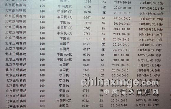 2013年10月9日,北京正明赛鸽俱乐部“正明杯”2千元特比环、“正明杯”五千元特比环四关鸽王赛第一关比赛,李国民先生两羽赛鸽以领先16分钟的优势先后报到,获冠亚军,成绩分别是:
