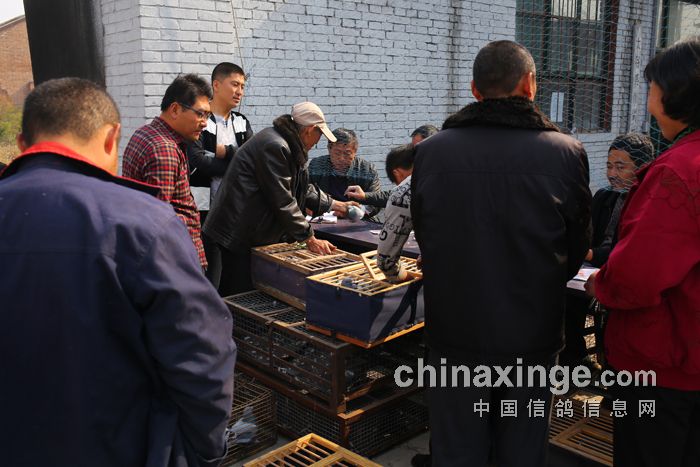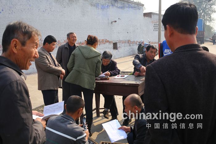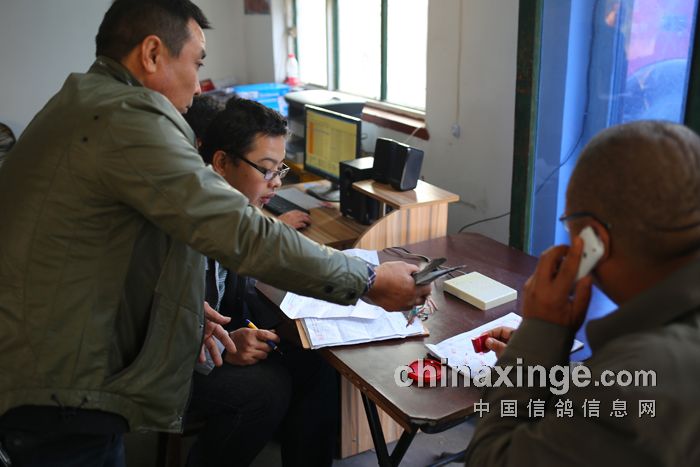 晋中市信鸽协会主席冀聪明,最新取得千羽千翔殿军的山西翎声亮(中远处手拄水杯者)籍俊林,与公棚冠军得主孟志明在指定鸽收费处