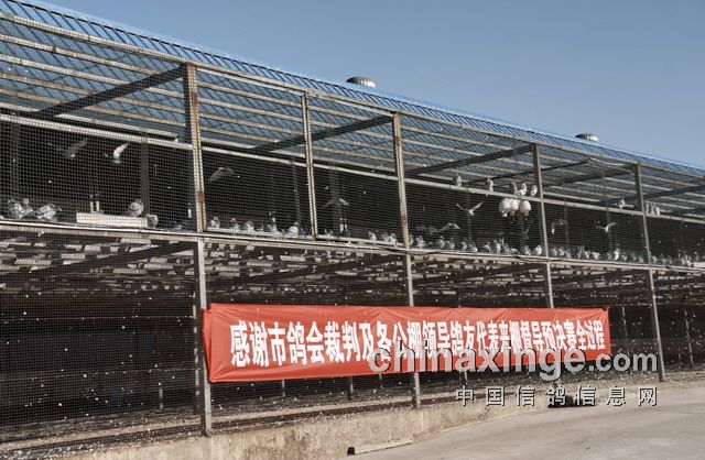 上午唐山市信鸽协会的裁判人员早早来到公棚进行集鸽准备工作,监赛鸽友也拭目以待,领航公棚主办方及业内友好单位挂出横幅以示祝贺。