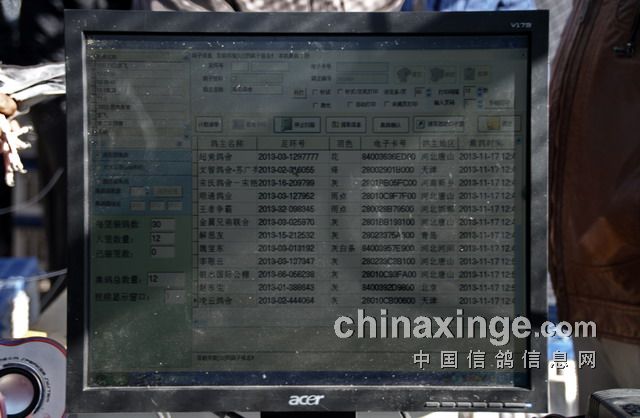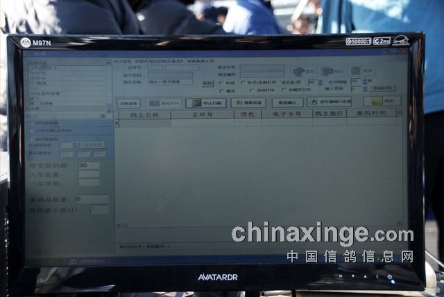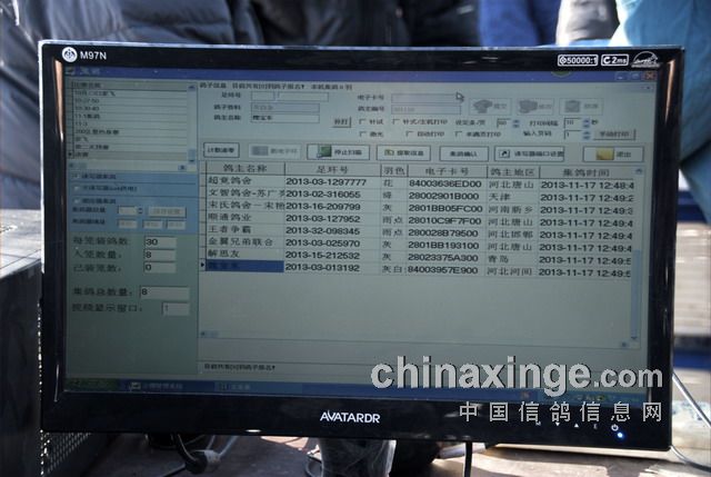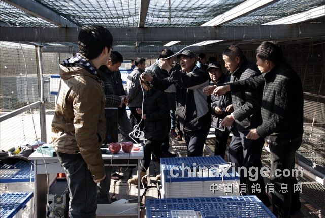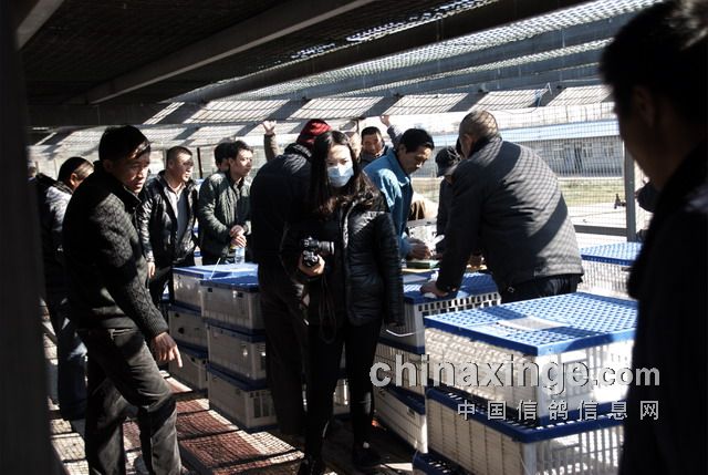 下午十二点半电脑连线完毕,裁判人员及鸽友监赛代表进入公棚开始集鸽。饲养员分别将赛鸽装到运送笼,十个集装笼分两排摆放在轨道平板车上,由饲养员推到集鸽裁判员处,然后由裁判员扫描盖章装入放飞笼,鸽友代表在场监督。