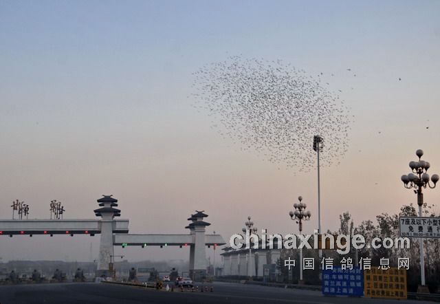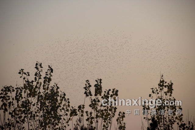 当赛鸽车行驶到衡水境内,见到空中有赛鸽回归。它们一会飞起一会低飞始终在树梢高度上下飞行。