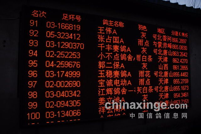 都说平原的赛鸽好飞,所以参赛鸽友选择快速赛鸽一决雌雄。事实看来,公棚赛的变数很大,参赛鸽友要做好各种准备,以便应对不同情况的发生,像这场决赛耐力鸽就占了上峰。根据赛鸽飞行时间来看本次决赛下午二点五十左右才到鸽子,赛鸽连续飞行将近八个半小时,到傍晚归巢鸽要连续飞行十小时以上,这是速度鸽无法承受的。所以建议参赛鸽友在选拔赛鸽的时候一定要兼顾多种因素,打公棚快速鸽、耐力鸽、吃天的赛鸽都要有一定的比例为好。
