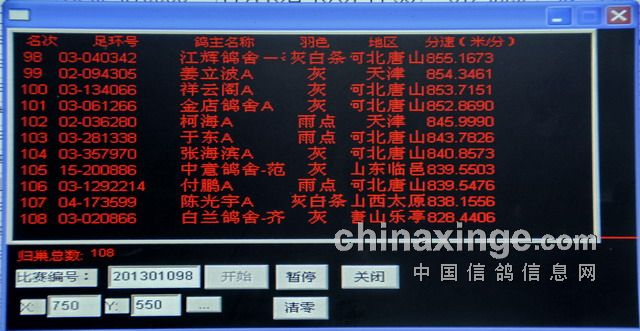 当天归巢羽数一百零八羽,最后一羽乐亭白兰鸽舍齐文博
