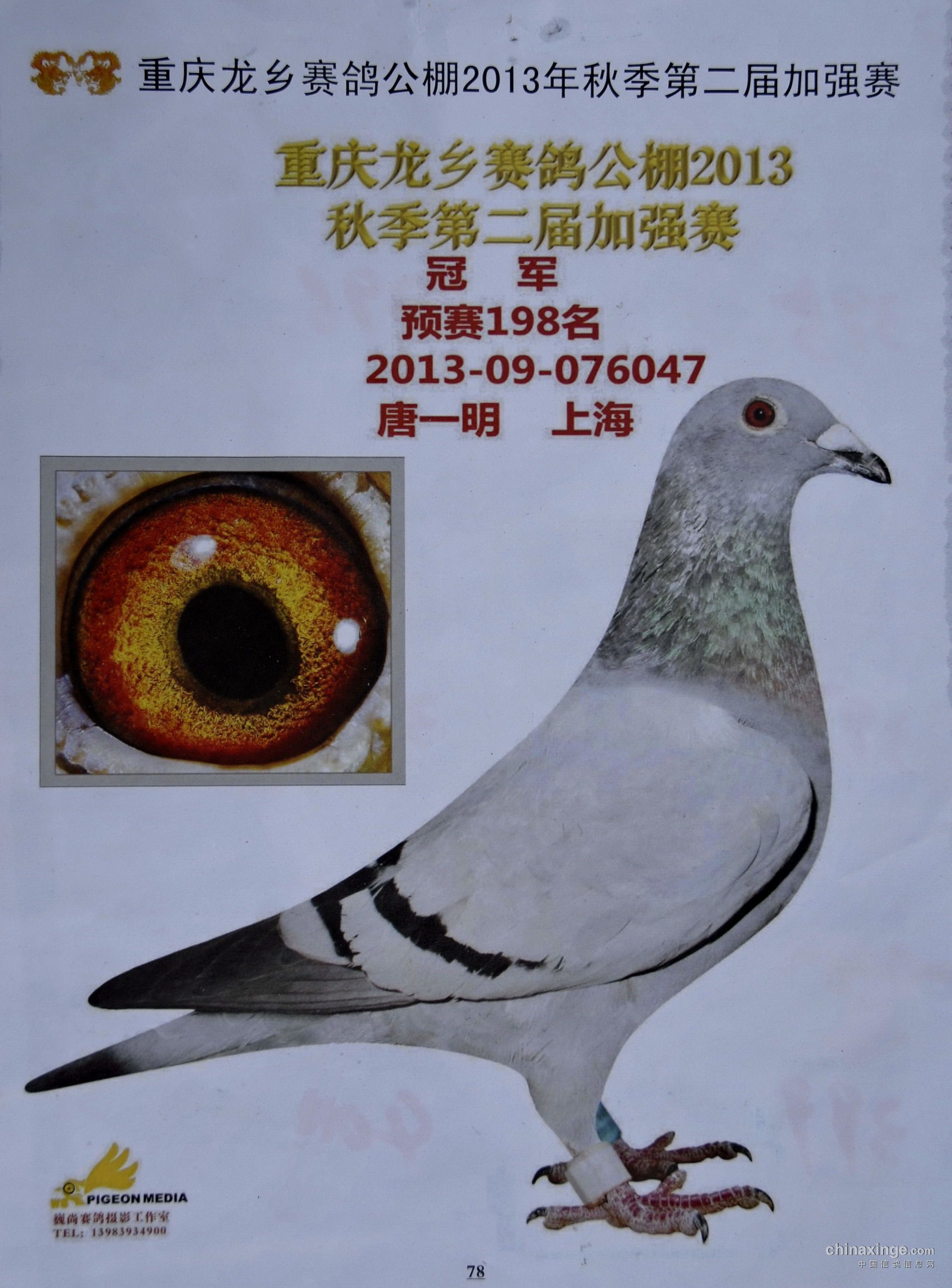 从拍卖手册上我们了解到龙乡赛鸽公棚2013年第二届公棚赛集鸽七千零五十一羽,三十公里放回清棚数字是六千一百二十羽;二百三十四公里预赛上笼四千三百六十羽,当日归巢四千零八十七羽,冠军分速一千三百三十米。决赛空距四百三十八公里,上笼四千三百六十羽,当日归巢一千零九十二羽,冠军分速一千一百四十九米。加强赛空距四百四十八公里,上笼一千九百三十羽,当日归巢一千零九十二羽,最高分速一千二百九十米。从上述数据来看2013年龙乡赛鸽公棚竞赛取得了圆满的成功。