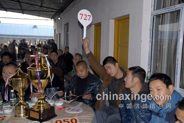 上午九点三十分,龙乡赛鸽公棚获奖鸽拍卖会举行,本届拍卖会分两天进行。今天拍卖的获奖鸽有决赛的二百五十一名到四百名;加强赛的冠军到一百六十三名。