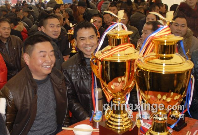 看,这位获奖鸽友看着获得的奖杯多高兴