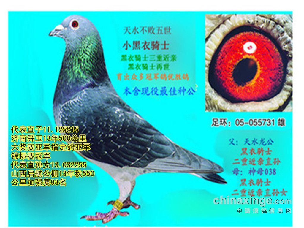 父:天水皇帝022894雨点黄眼雄,500公里2次,1次13名,1次亚军;1000公里3次,1次总冠军;
