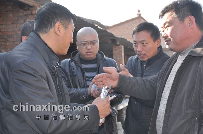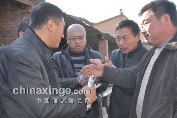图片说明:太谷强豪,13年盛世荣翔决赛亚军得主杨新鸽舍(右二)看过黄金配对雌雄后与众强豪交流看法。