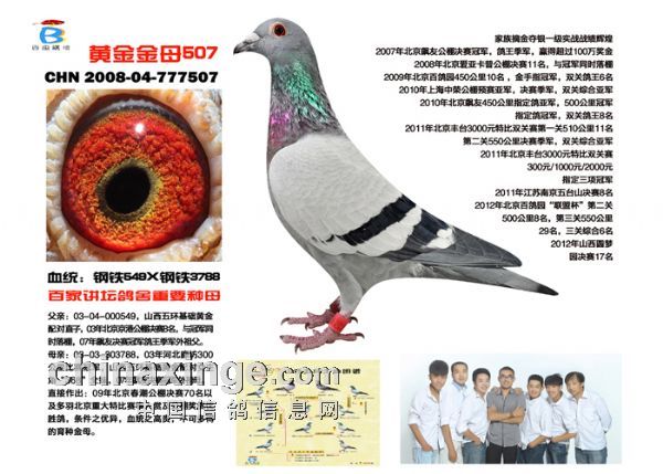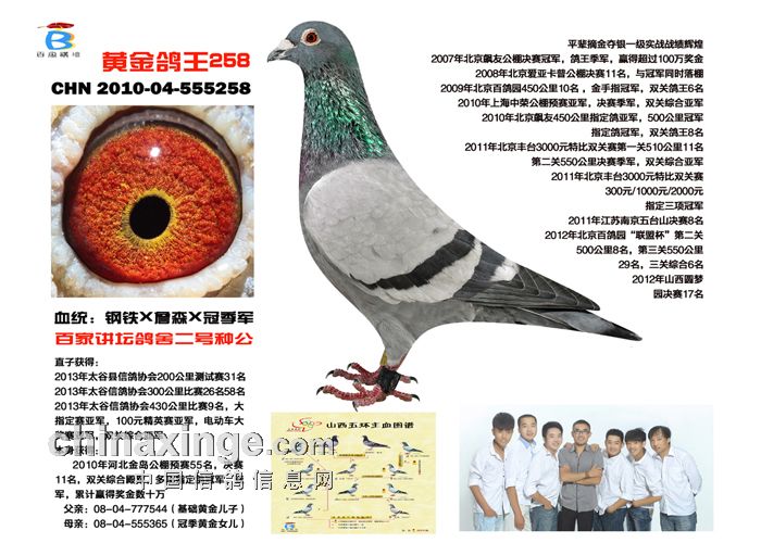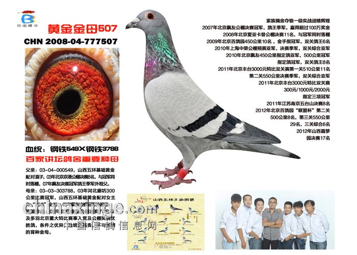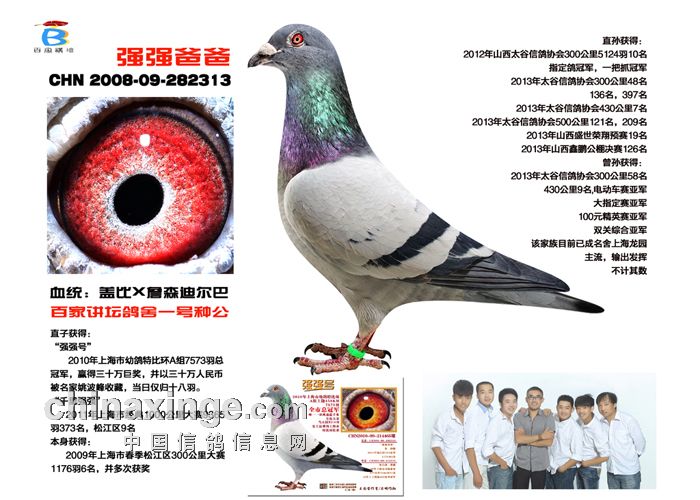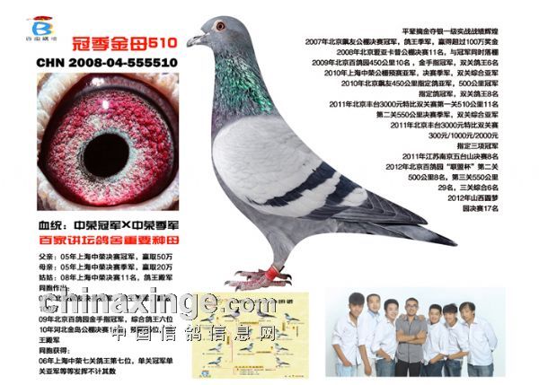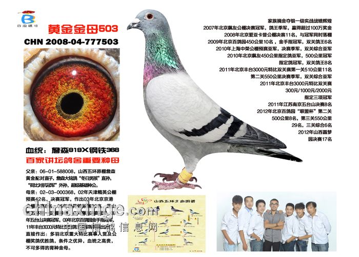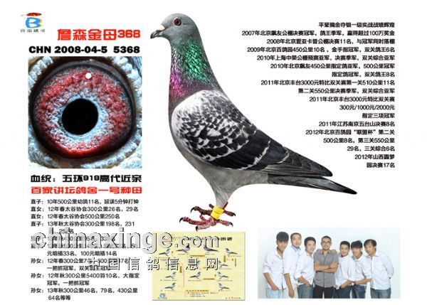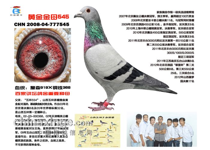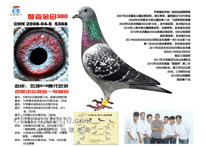 “战绩能持久延续的强豪,都是自己会育种的能手,山西五环王斌王总,作为山西帮的一面旗帜,实力和影响力毋庸置疑,十年前,凭借强大财力与宽阔的人脉,每年都请高人赴晋,在育种及比赛方面虚心求教,王忠宝是其中对五环帮助最大的一位。我似乎更幸运,深得两位王总厚爱扶持,也因此,王忠宝2010年的特比冠军‘强强号’的父亲,姑姑,及平辈十多羽共同构成了鸽舍的第一家族(盖比系);山西五环的一羽詹森919高代近亲雌,从入棚即开始连年发挥,13年冬终得王总首肯,导入成功五环百万家族,融合詹森919,钢铁利摩日,中荣冠季军三大冠军家族的黄金种鸽近十羽。这样完全遵照既定经验的‘配方’式的系统引进,当然是期望收到前人栽树后人乘凉的效果。两个王总对近亲繁殖与杂交,无论时机的把握还是个体的选择,可以说是一脉相承的,当欣赏他们自己作育的接班种鸽,无论外观还是内在的‘种气’让观者不由感慨时,也就明白他们为什么总是轻易就赢得大冠军,而且可以持久保持高水准。”