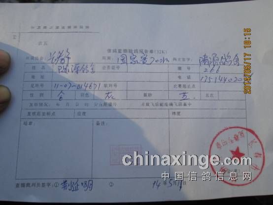 长春市信鸽协会2014春季700公里国家赛集鸽1599羽,共计录取160名,5月17日早上6点在锡林浩特放飞。比赛前20名成绩初榜如下: