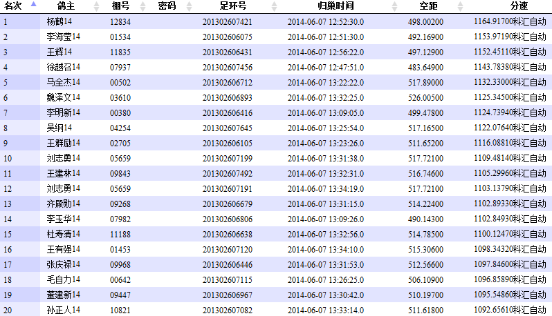根据直播平台,比赛于12点50分左右见鸽报到,杨鹤、李海莹、王辉暂排前三名。以下是前20名报到数据截图: