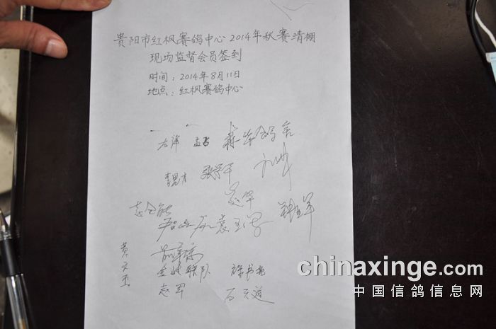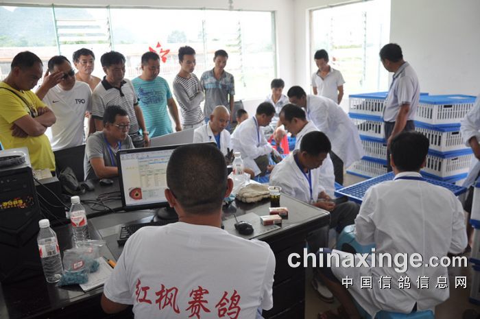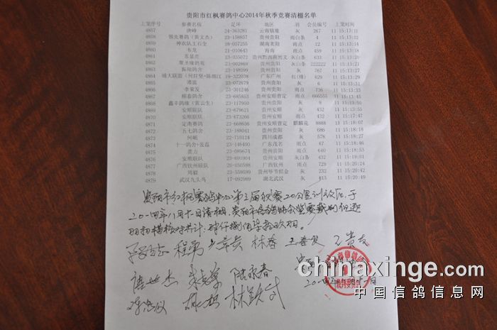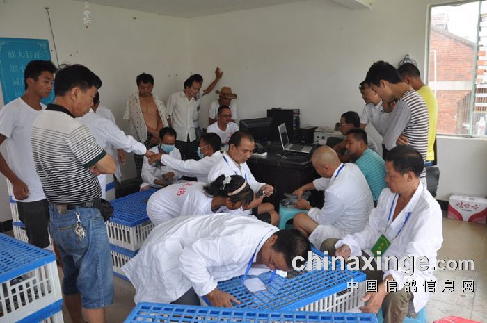 贵州红枫赛鸽中心第三届秋赛20公里训放后,于8月11日进行清棚验鸽工作。经贵阳市鸽协裁判组逐羽扫描、核对足环,共计存棚羽数4879羽。 另外,贵阳市信鸽协会认定以下三羽赛鸽属无效足环:(1)23-000165,(2)23-885451,(3)23-885454,因此,取消其竞赛资格。 贵州红枫赛鸽中心2014年第三届秋季竞赛清棚(图)