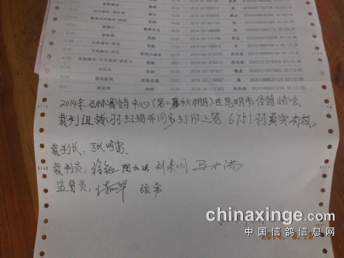 2014年云南石林赛鸽中心第二届秋赛10公里查棚,在昆明市信鸽协会派出的裁判组,呈贡、陆良、石林、玉溪、大理、贵阳等地鸽友参与监督之下,于2014年8月15日19时00分开始逐羽扫描上笼,共集鸽上笼6751羽正式有效参赛鸽。