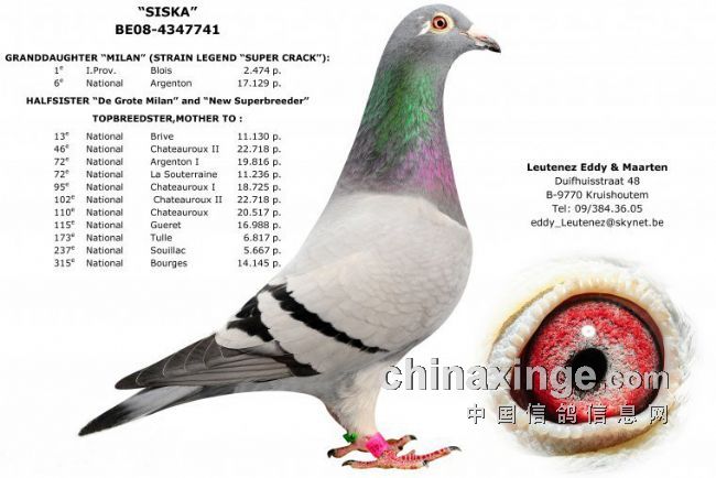 图片说明:丝丝卡,是米兰的孙女,米兰是超级克拉克血统,米兰自身获得布鲁瓦省赛2474羽冠军、亚精顿国家赛17129羽6名。丝丝卡作出子代获得11130羽13名、查特鲁-2国家赛22718羽46名、亚精顿19816羽72名、拉索特年11236羽72名、查特鲁-2国家赛18725羽95名,等等。