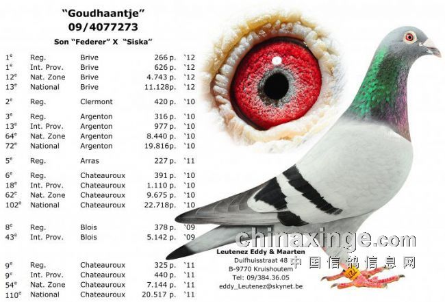 图片说明:好手号,是费德勒和丝丝卡的直子,自身获得2012年布瑞福国家赛11128羽13名、2010年亚精顿国家赛19816羽72名、2010年查特鲁国家赛22718羽102名、2011年查特鲁国家赛20517羽110名,等等。