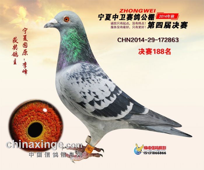 | 沈明:2014年对于我来说,是一个平顺的一年,没有什么大起大落,14年在国盛公棚交鸽两羽,结果到清硼时已经一无所有。在黄河公棚交鸽两羽,到清硼时剩一羽,决赛500未归。中卫公棚交鸽两羽,决赛一羽188名,另一羽500多名,所有今年算是小赢。总结了自己在2014年的得失,心里还是美滋滋的,在这里也秀一秀我的2014年的获奖鸽。总结经验,再接再厉,争取在2015年有一个好的成绩,在来和各位鸽友们在欢聚一堂,同时也祝愿各位鸽友在2015年中能更上一层楼,最后,衷心祝全国鸽友身体健康、万事如意。 |