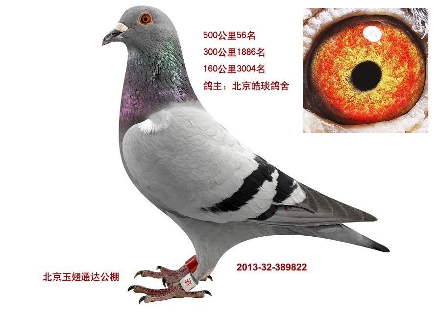 北京玉翅通达公棚决赛56名参赛羽数2969羽【同场赛事其父母鸽的曾孙代获得306﹑315名。子代2012年获玉翅通达公棚166名】,此鸽平辈获2013年BOB公棚预赛6名【5861羽】,2012年北京玉翅通达公棚决赛亚军【4031羽】.