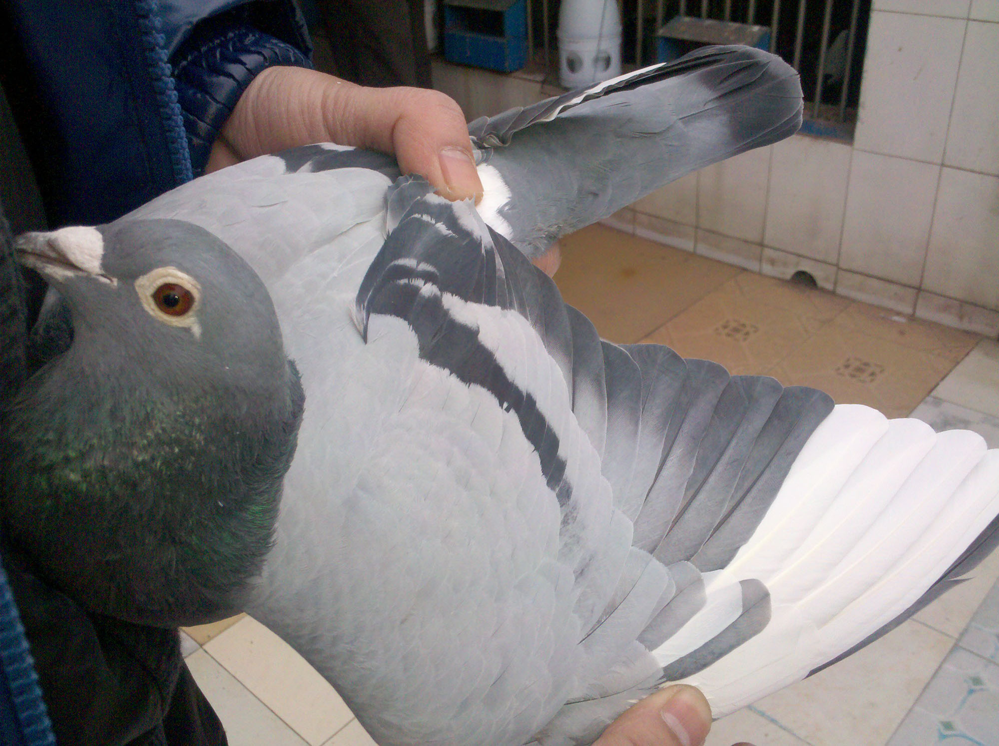 灰白条,黄眼,03年晚生鸽,年底没有脚环了故戴02年环,凡布利安娜原棚96年灰黄雄*詹森灰白条黄眼雌(本身99年双关鸽王),同窝双雄中的偏雄。