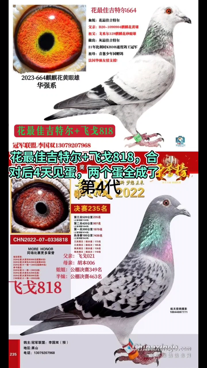 同父异母4姐弟: 飞戈615和飞戈818是雌鸽,由飞戈021x胡本006作出。 飞戈852是雌,飞戈555是雄,由飞戈021X加站86名作出。 如果想回血保种,有几种版本? 同父同母姐弟配,同父异母姐弟配,您喜欢哪方式呢? 也可以和它们的父亲021,以及爷爷667回血。 也可以和它们的父亲021,以及爷爷667回血。