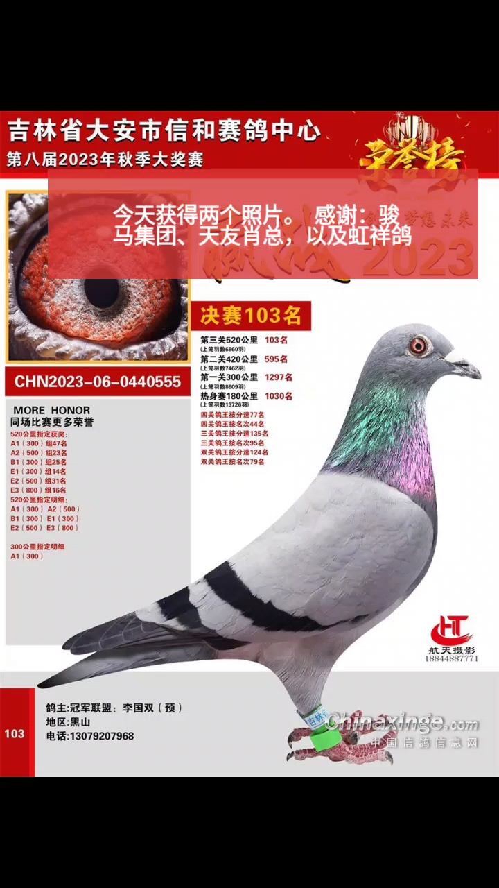 今天获得两个照片。 感谢:骏马集团、天友肖总,以及虹祥鸽业。 以及2个公棚的老板, 也感谢支援我的家人和朋友们!