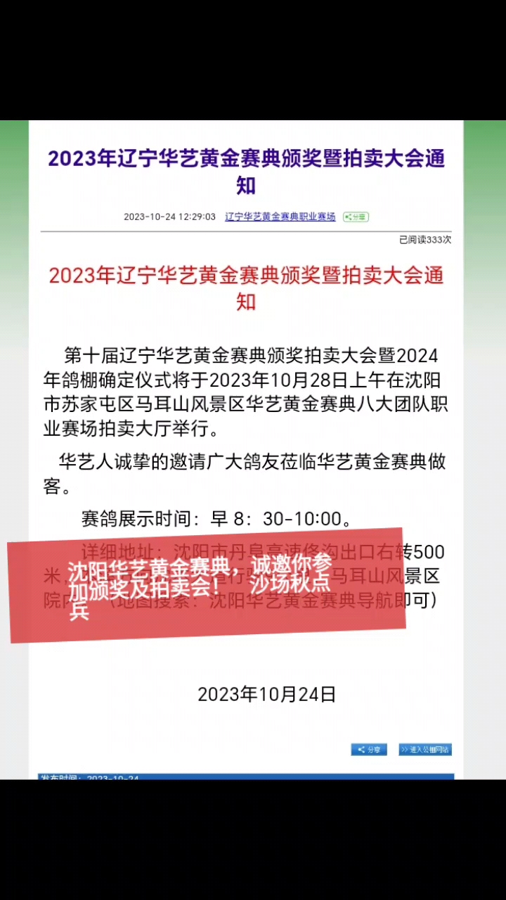 沈阳华艺黄金赛典,诚邀你参加颁奖及拍卖会! 沙场秋点兵,全国各地的健儿,齐聚华艺黄金赛典。 八军统帅排兵布阵,经过四关鏖战,80名精英脱颖而出,综合冠亚季军,座次排列。 好客的华艺人,为了鼓舞士气,表彰众将士,特意举办颁奖及拍卖会,诚致邀您参加! 届时,领略一下4关健儿的风采,品尝一下地道的东北美食。 同时也是一次引进优秀种鸽的绝佳机会。