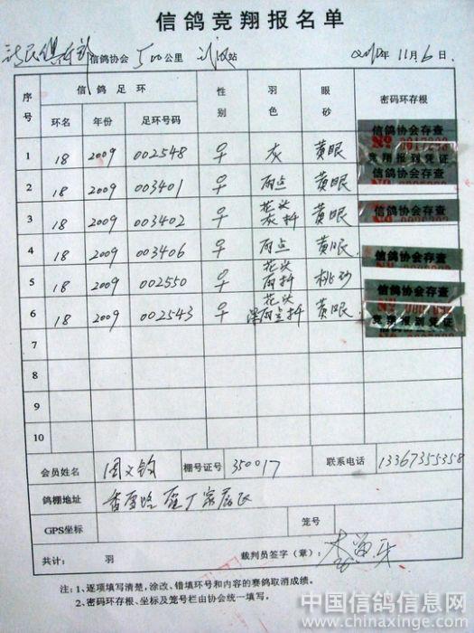 鸽友填写的信鸽竞翔报名单