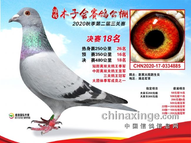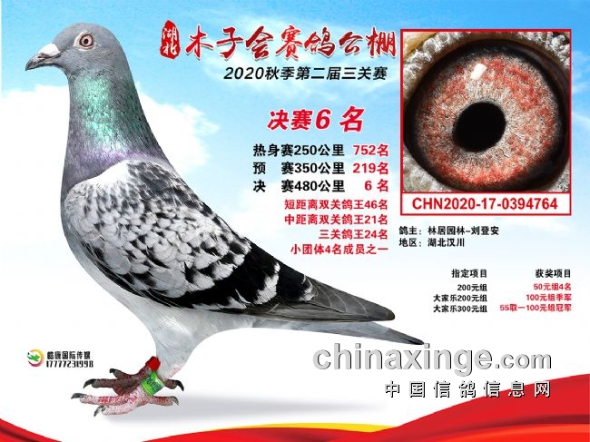 湖北鄂州木子会赛鸽公棚2020年本着不以盈利为目的,为工薪鸽友打造一个玩得起的赛鸽平台。在各地疫情影响的情况下,依然收鸽超过6000羽,可见鸽友对木子会公棚的支持和关注。经过一个多月的激烈比拼,所有赛程圆满结束,四关比赛连战连捷,前两关归巢超八成,决赛超七成,高分速、高归巢率,给鸽友们交了一份满意的答卷。伦飞赛鸽-汪伦的17-0096596雨点白条鸽从预赛2000名开外,一路逆袭拿下冠军,并赢得5个指定冠军、幸运奖冠军,获得免费汽车一辆,是今年的大赢家之一。赵家大院赵生炎的17-0334885灰鸽三关稳定,均入前30名,飞出了一关26名、二关16名、三关18名的好成绩,获得三关鸽王冠军。