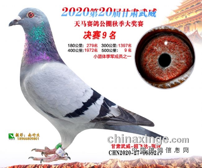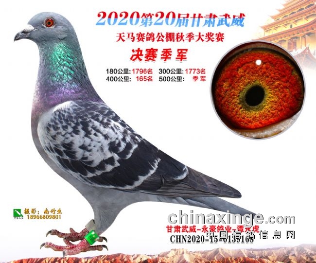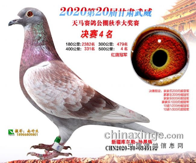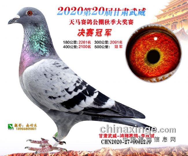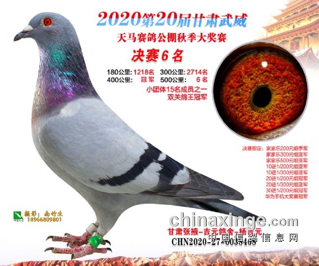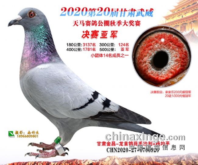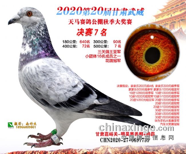 甘肃武威天马赛鸽公棚2020年第二十届四关竞赛随着最后一次加站赛赛鸽们的英勇归巢而圆满结束。回顾此次秋赛,亮点颇多。四关冠军的分速一关比一关快,决赛冠军鸿翔赛鸽-李成斌环号2020270062210一枝独秀,领先亚军超8分钟打钟归巢,飞出1508.7988米/分高分速。比赛还设有团体赛、三关鸽王、二关鸽王以及特别的彩鸽奖。为感谢新老会员对天马赛鸽公棚的大力支持与信任,决赛特增加100个名次回馈鸽友,奖金各2000元。
