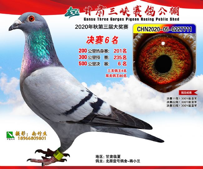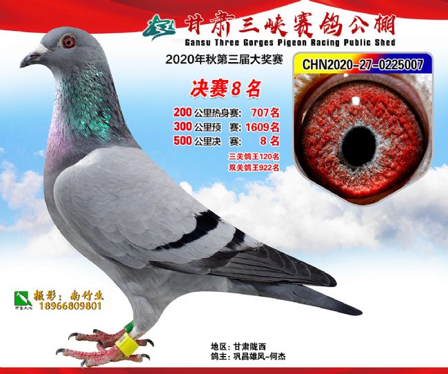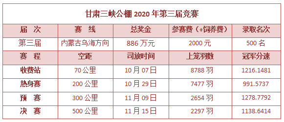 决赛当天归280多羽,至次日上午10点10分前500名全部报满。甘肃陇南何小录获得10、236、310名,拿下团体冠军,赢得路虎极光汽车一辆。甘肃皋兰姚财祥的2020-27-0942252灰鸽飞出了一关16名、二关496名、三关115名,以3103.4286米/分的总分速获得三关鸽王冠军。
