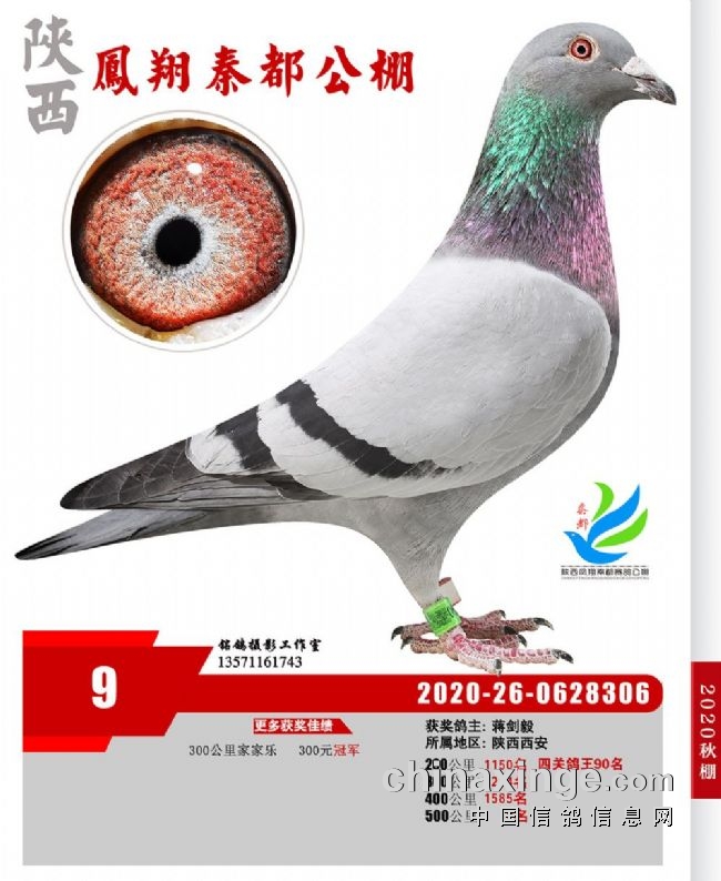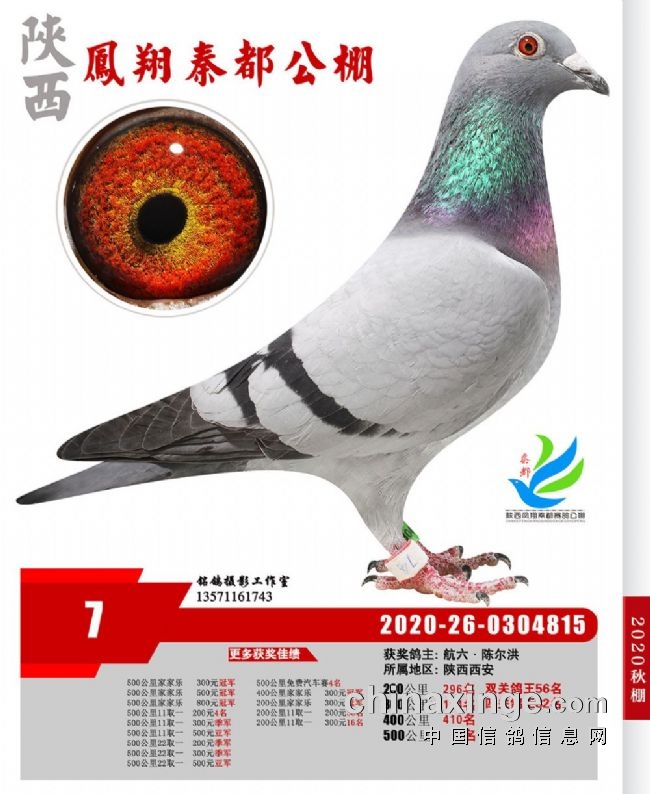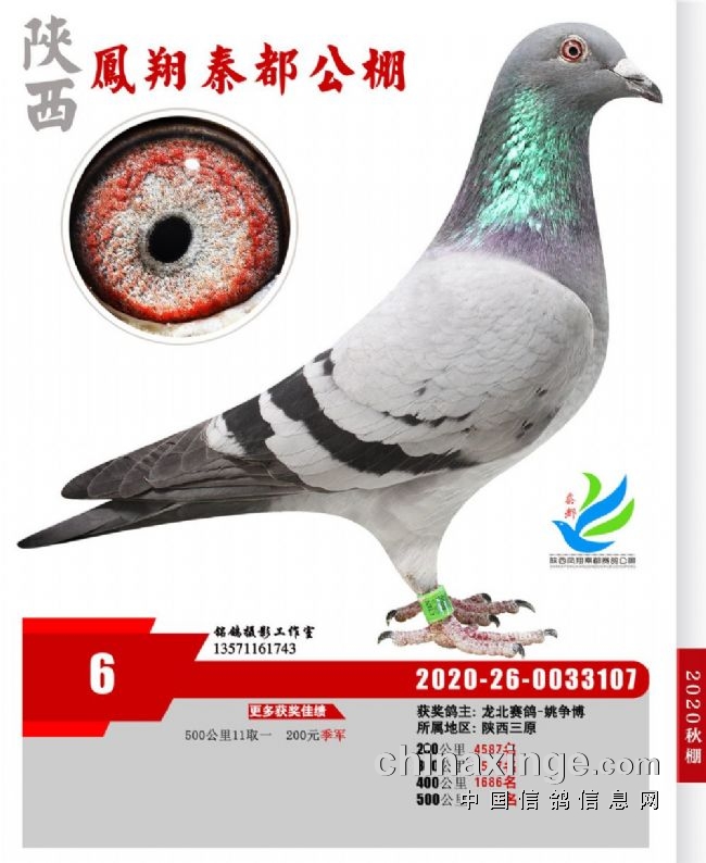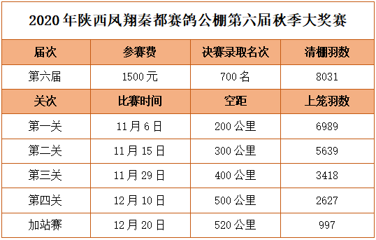 凤翔秦都公棚2020年第六届秋赛设四关赛、精英赛、团体赛、鸽王赛、汽车大奖赛、加关赛,总奖606万元,六辆免费汽车作为嘉奖,为回馈鸽友,决赛另增加200个获奖名额,吸引了众多赛鸽高手前来挑战。经过多站训放,6989羽赛鸽取得首关比拼入场资格,在11月6日进行的首关200公里考验中,前百名5分钟内报满,归巢率80%以上。第二关300公里挑战难度增加,5639羽赛鸽出笼,近六成精英顽强凯旋,成功晋级,最高分速1259.6559米/分。第三关400公里稳扎稳打,3418羽赛鸽开笼,75%以上勇士顺利凯旋,最高分速1226.416米/分。