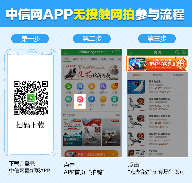 由于目前疫情尚未完全解除,政府对跨区域异地室内大型人员聚集严格管制。为响应上级管理部门防疫要求,为了大家的安全,以大局为重,公棚决定联合中信网举办“无接触智能网络拍卖会”,全程通过中信网直播展示获奖鸽,开启出价拍卖,全程无接触,不聚集,边看直播边拍鸽,轻松安全更省心!