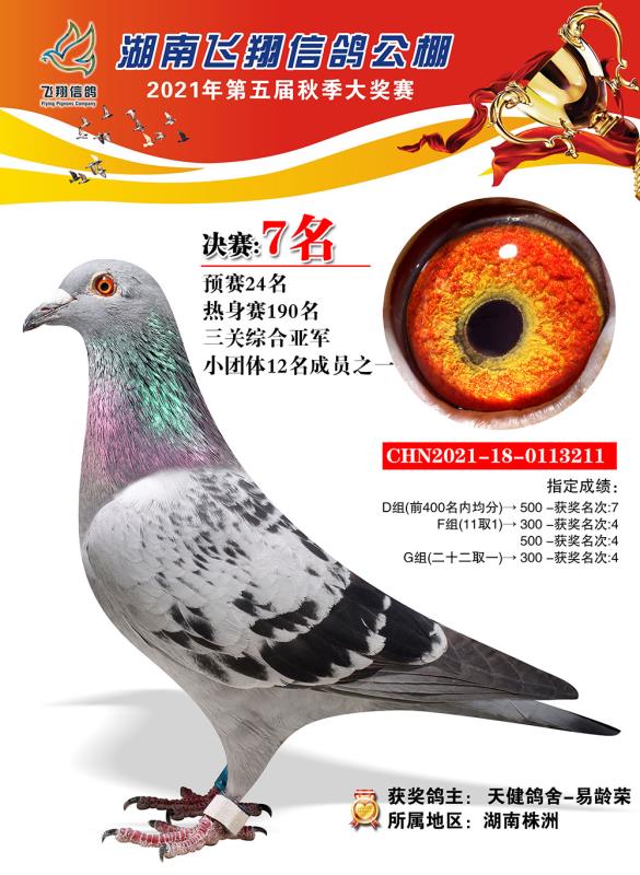 唐彪+周元的一羽2021180072187灰鸽以热身赛5名、预赛10名、决赛17名的成绩成功夺下第五届秋赛三关综合鸽王鸽王冠军,可谓是关关快、关关稳!天健鸽舍-易龄荣的一羽雨点鸽,以三关合计分速3697.6567米/分,拿下鸽王亚军。涌金阁-金涌在此届比赛中也有亮眼表现,热身赛小试身手拿下152名,预赛一举拿下亚军,决赛最终拿下20名,综合成绩荣获三关鸽王亚军,至此湖南飞翔公棚2021年第五届秋赛顺利落下帷幕。