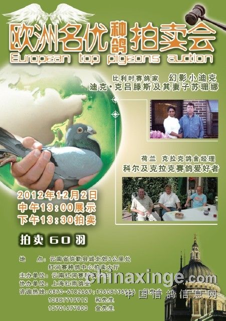 欧洲名优种鸽拍卖会将于2012年12月2日在云南红河赛种鸽中心拍卖大厅举行,中午13点展示,13点30分开始拍卖。