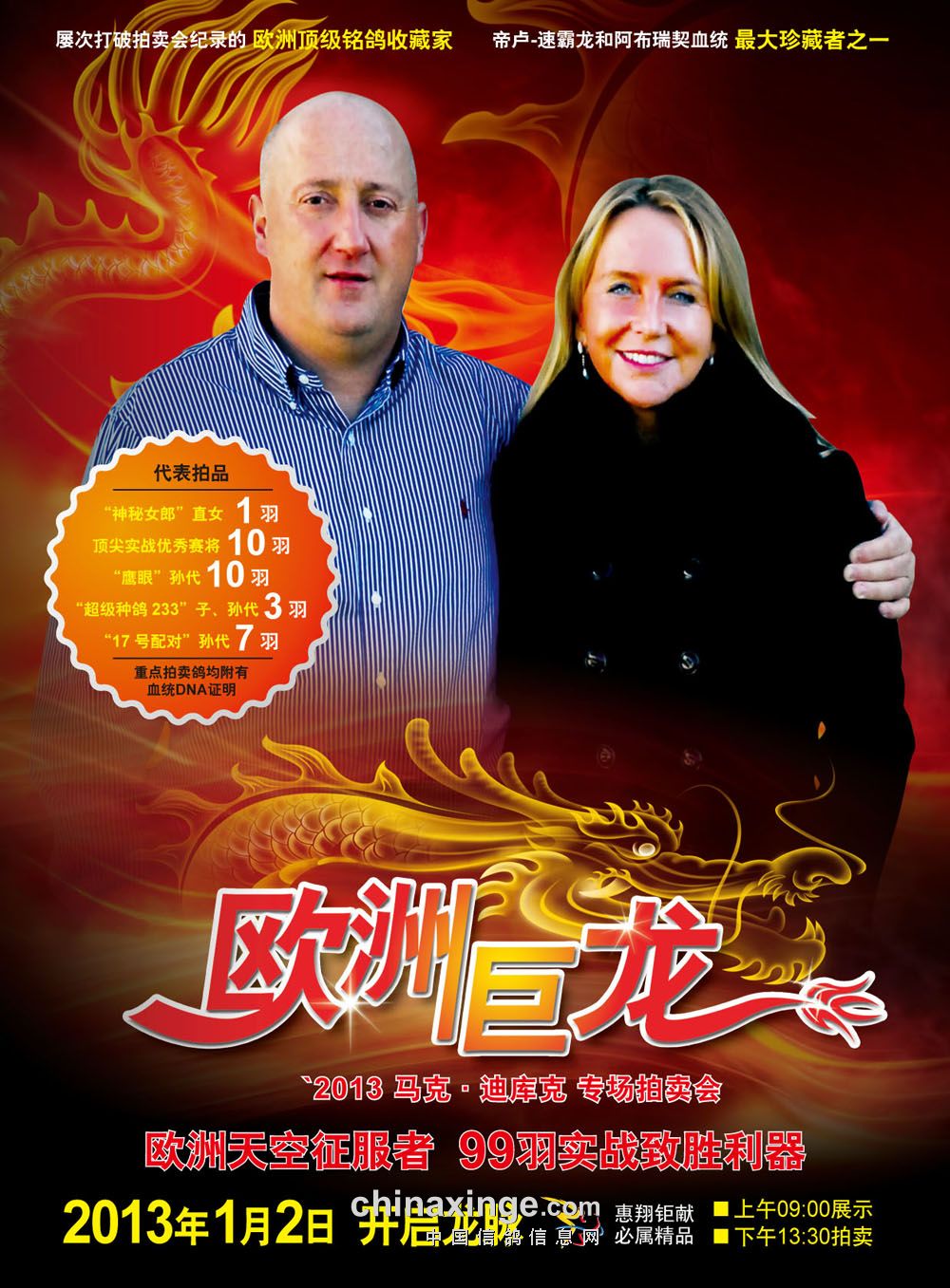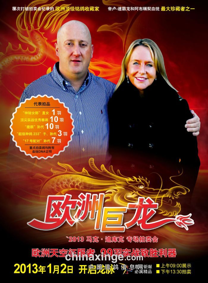 2013年1月2日马克.迪库克北京拍卖会将在盛芳艺园生态美食城举办,届时马克.迪库克夫妇将亲临现场,与各位鸽友交流。