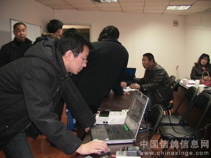 天津市信鸽协会副秘书长邵先生正在认真了解电子扫描鸽钟具体使用方法。