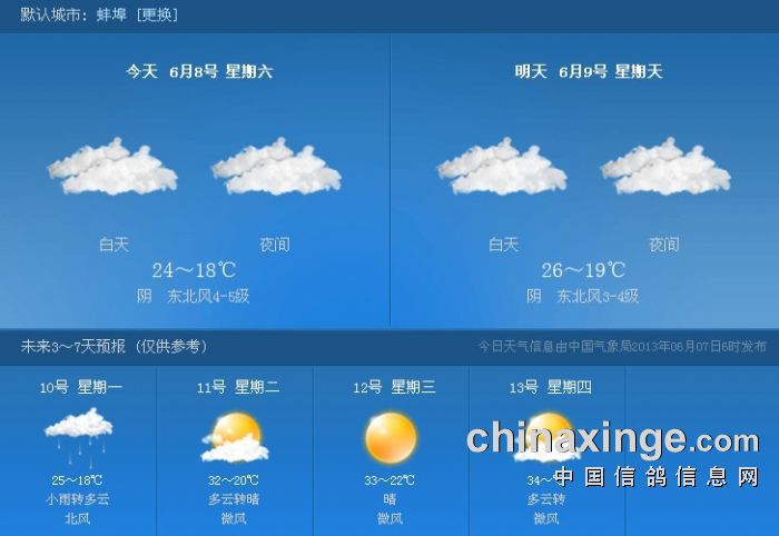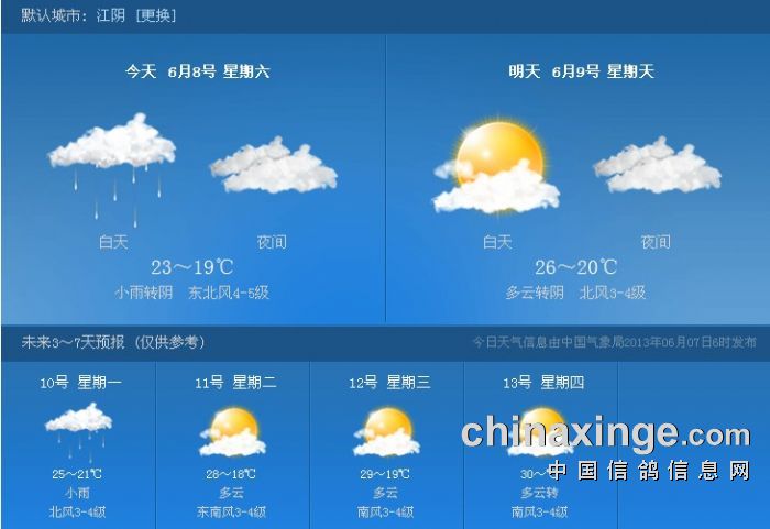 由于天气原因,江阴振宇赛鸽中心原定于2013年6月8日集鸽,于2013年6月9日进行280公里预赛延期至6月10日集鸽,6月11日进行280公里预赛。