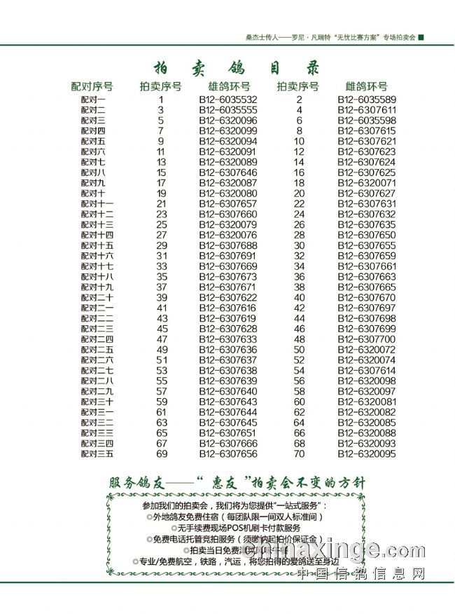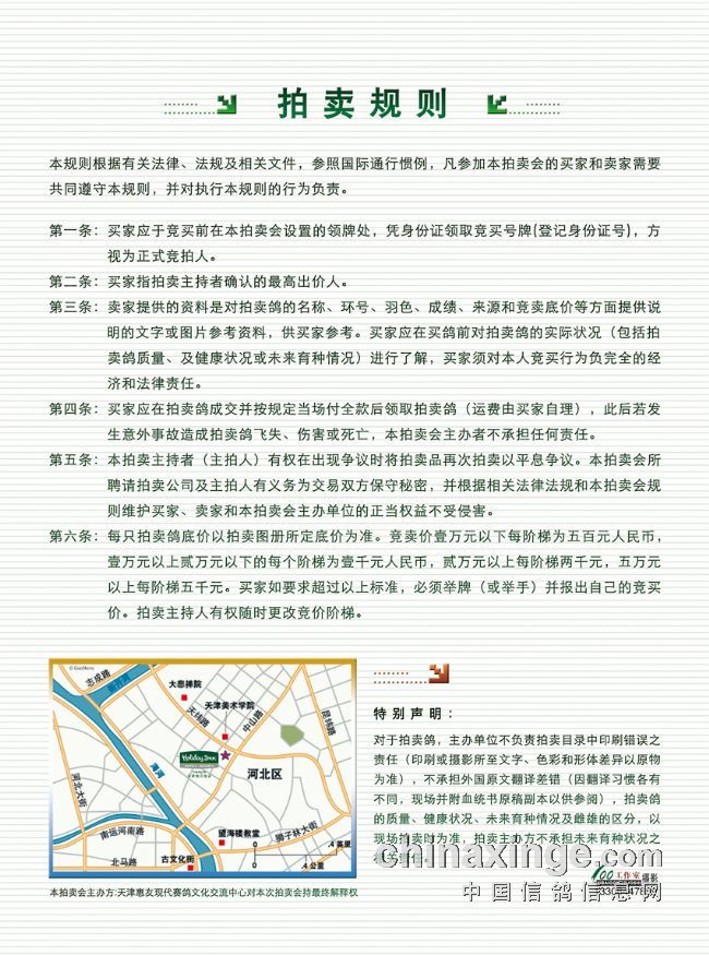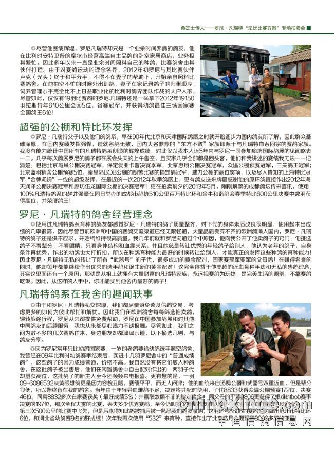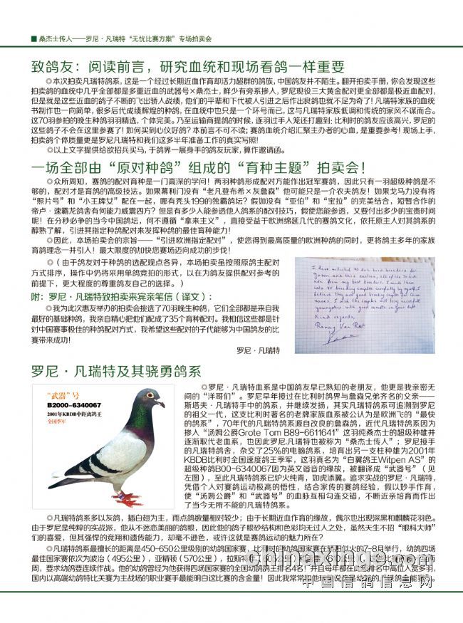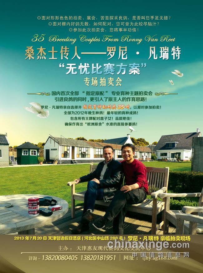 拍卖地点:天津智选假日酒店(河北区中山路288号)罗尼.凡瑞特亲临拍卖现场 拍卖时间:2013年7月20日 主办单位:天津惠友现代赛鸽文化交流中心 详情咨询:13820080405 13820181951 联系网址:tjhy.ag188.com 拍卖鸽手册:桑杰士传人——罗尼.凡瑞特专场拍卖会