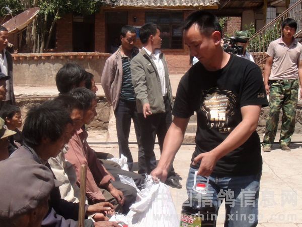 安宁昆钢鸽会的小代鸽友把鸽友义捐的爱心粮油亲自送到村民手里。