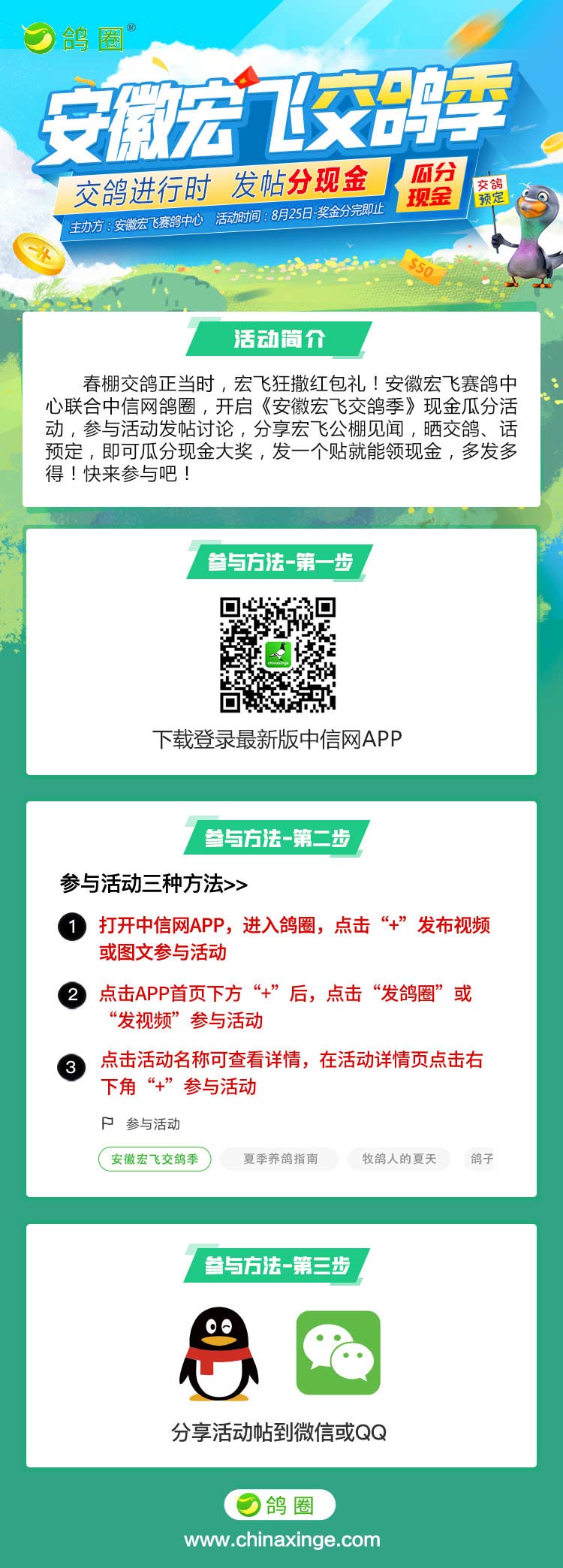 春棚交鸽正当时,宏飞狂撒红包礼!安徽宏飞赛鸽中心联合中信网鸽圈,开启《安徽宏飞交鸽季》现金瓜分活动,参与活动发帖讨论,分享宏飞公棚见闻,晒交鸽、话预定,即可瓜分现金大奖,发一个帖就能领现金,多发多得!快来参与吧!
