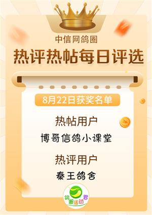 恭喜博哥信鸽小课堂和秦王鸽舍获得8月22日热帖和热评鸽友。忙了一整个夏天,