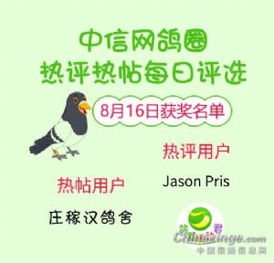 8月16日的热帖和热评鸽友分别是庄稼汉鸽舍和Jason Pris。感谢两位老铁,
