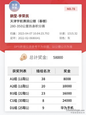 祝贺我0686641迎风飞翔,获得宇航春棚第一关13502羽78名