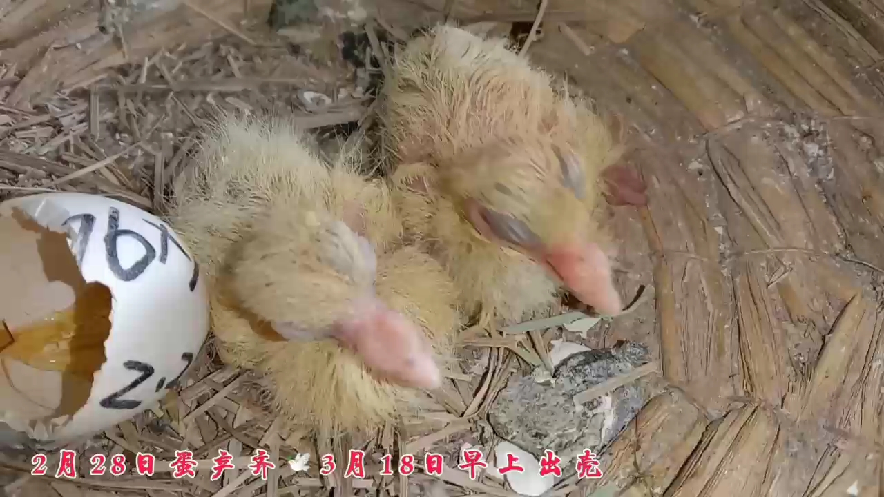 早上拍了段视频,差一点小鸽子被老鸽子给踩死。今年的第八组配对,2013年春棚决赛76名深雨点雄配桑杰士雨花雌758,在2月28日下午蛋产齐,孵化了差不多18天,小鸽子今天早上出壳了。