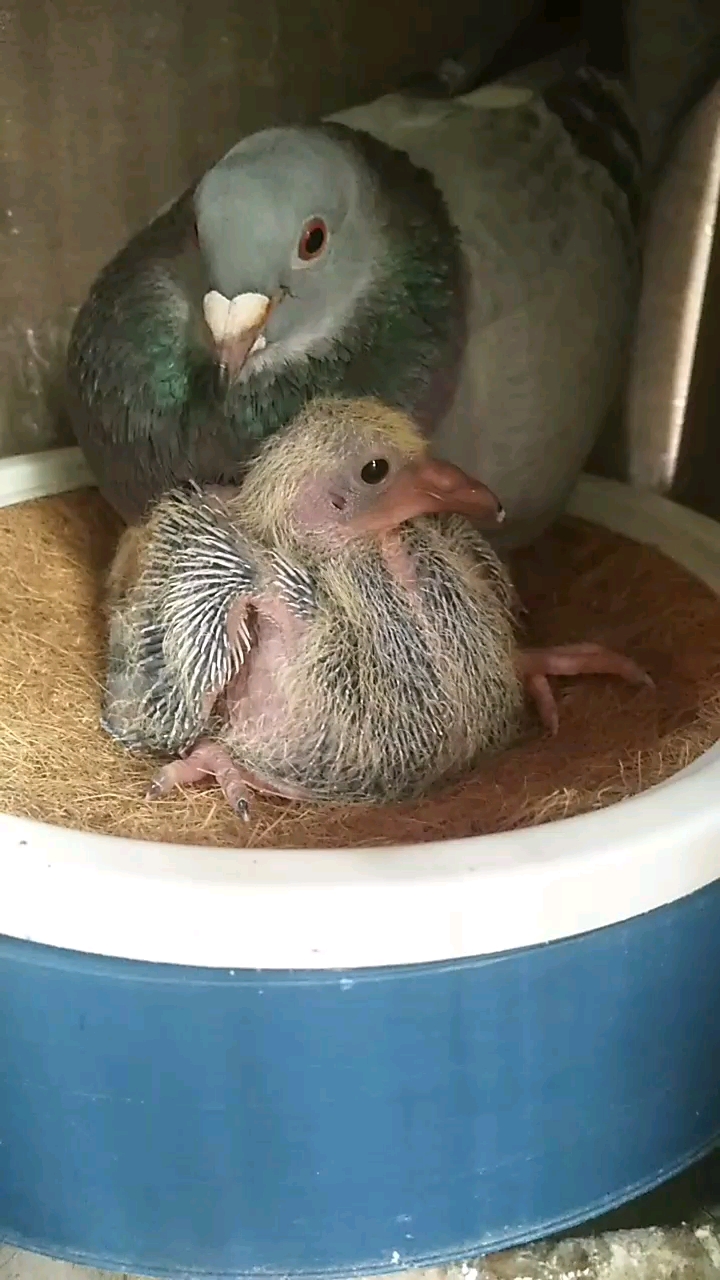 但只要孵化几天就正常了,它也特别护巢,你想看看鸽蛋时,它都会极力的用翅膀使劲拍打你。也许因为刚开始孵蛋不踏实这个小毛病,它每次孵化的蛋,差不多都要比其他同时产齐蛋的晚出壳一半天。鸽友们·下午好!