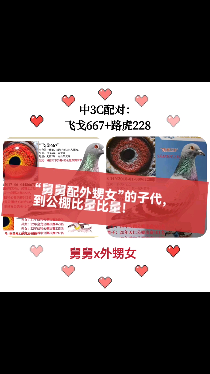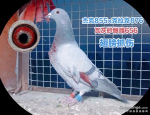 这羽灰雌是去年3月14日出壳,它的父亲是图中瓦灰砂眼白条雄855,是由公棚因疫情停赛而未进行比赛领回来的一只鸽子。母亲是一羽银灰黄眼鸽876,曾在公棚300km第一关和400km第二关挤进了前500名。瓦灰砂眼雌656去年秋季在协会参加了四关鸽王争霸赛,先后飞了一趟300km热身赛,第一关400km、第二关500km、第三关520km,因第三关遭遇大灭关,全鸽会归巢不足300羽而终止了第四关的比赛。