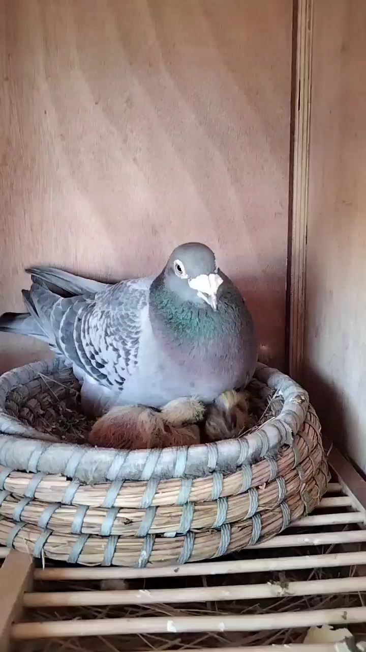 早上拍了段视频,差一点小鸽子被老鸽子给踩死。今年的第八组配对,2013年春棚决赛76名深雨点雄配桑杰士雨花雌758,在2月28日下午蛋产齐,孵化了差不多18天,小鸽子今天早上出壳了。 这羽深雨点雄是千公里亚军的儿子,曾作出过几羽小成绩鸽,比如像2020年春季的三关鸽王23名。这只深雨点雄有个小毛病,就是每次鸽蛋产齐后,刚开始孵化时不踏实,只要每次进棚到它跟前或附近,它都会起身。 但只要孵化几天就正常了,它也特别护巢,你想看看鸽蛋时,它都会极力的用翅膀使劲拍打你。也许因为刚开始孵蛋不踏实这个小毛病,它每次孵化的蛋,差不多都要比其他同时产齐蛋的晚出壳一半天。鸽友们·下午好!